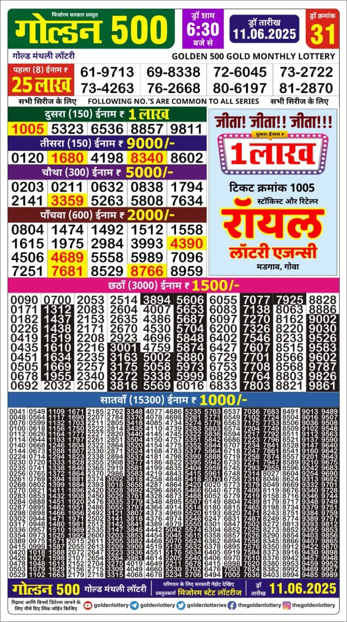 गोल्डन लाटरी का रात 9 बजे का रिज़ल्ट दिनांक 31.10.25