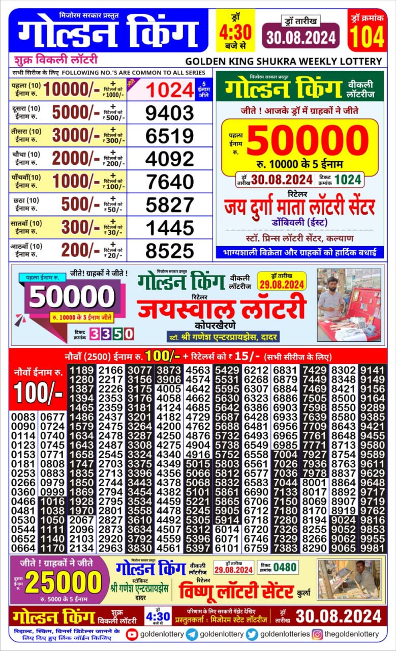 गोल्डन 100 लाटरी का रात 6:30 बजे का रिज़ल्ट दिनांक 6.8.25