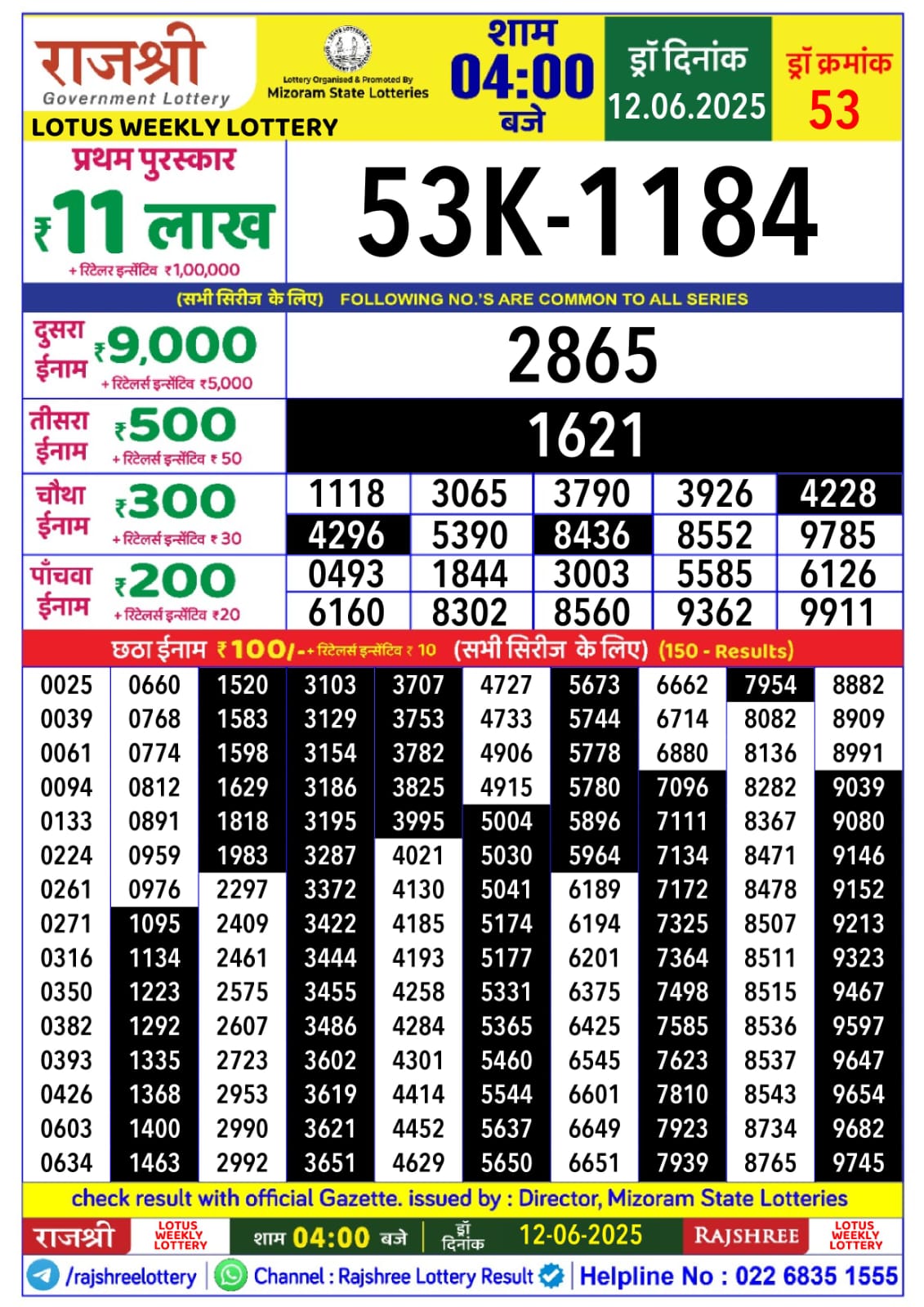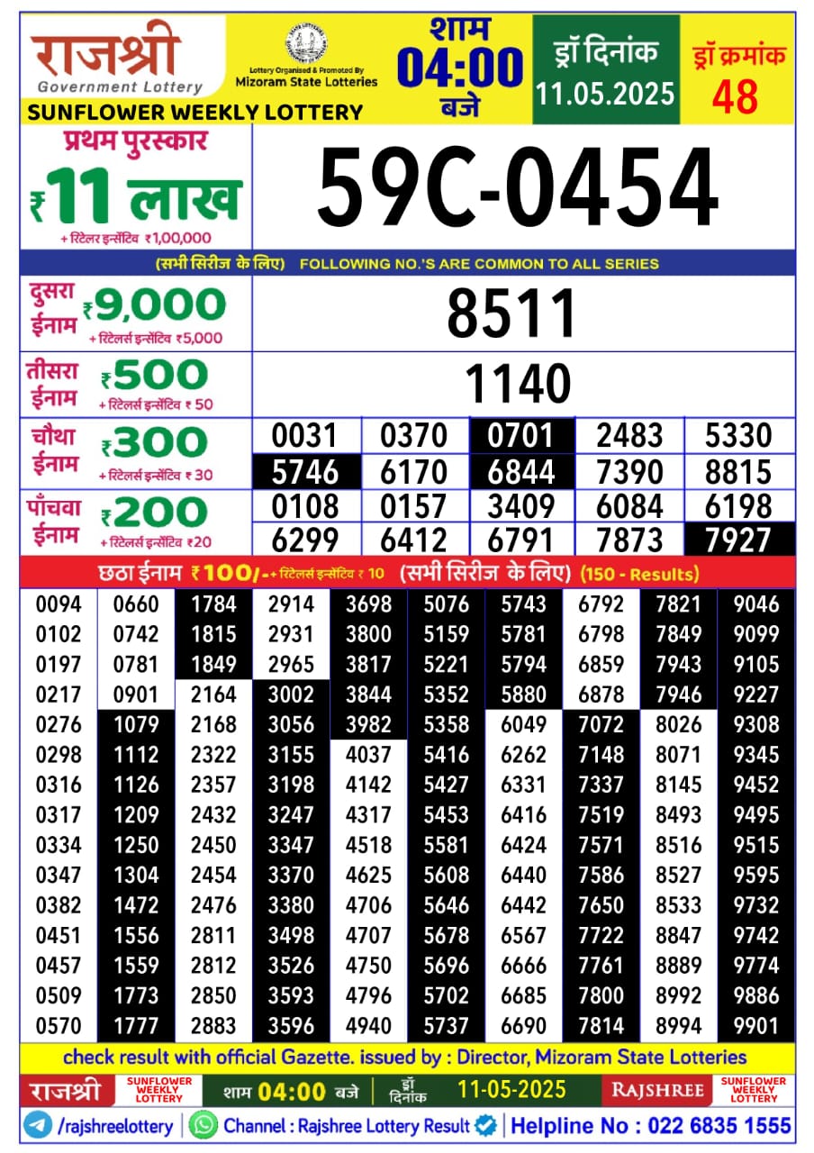 राजश्री लाटरी का 4 बजे का रिज़ल्ट दिनांक 11.12.25
