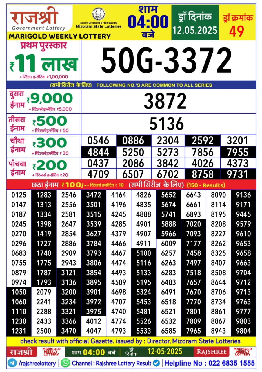 राजश्री लाटरी का 4 बजे का रिज़ल्ट दिनांक 12.12.25