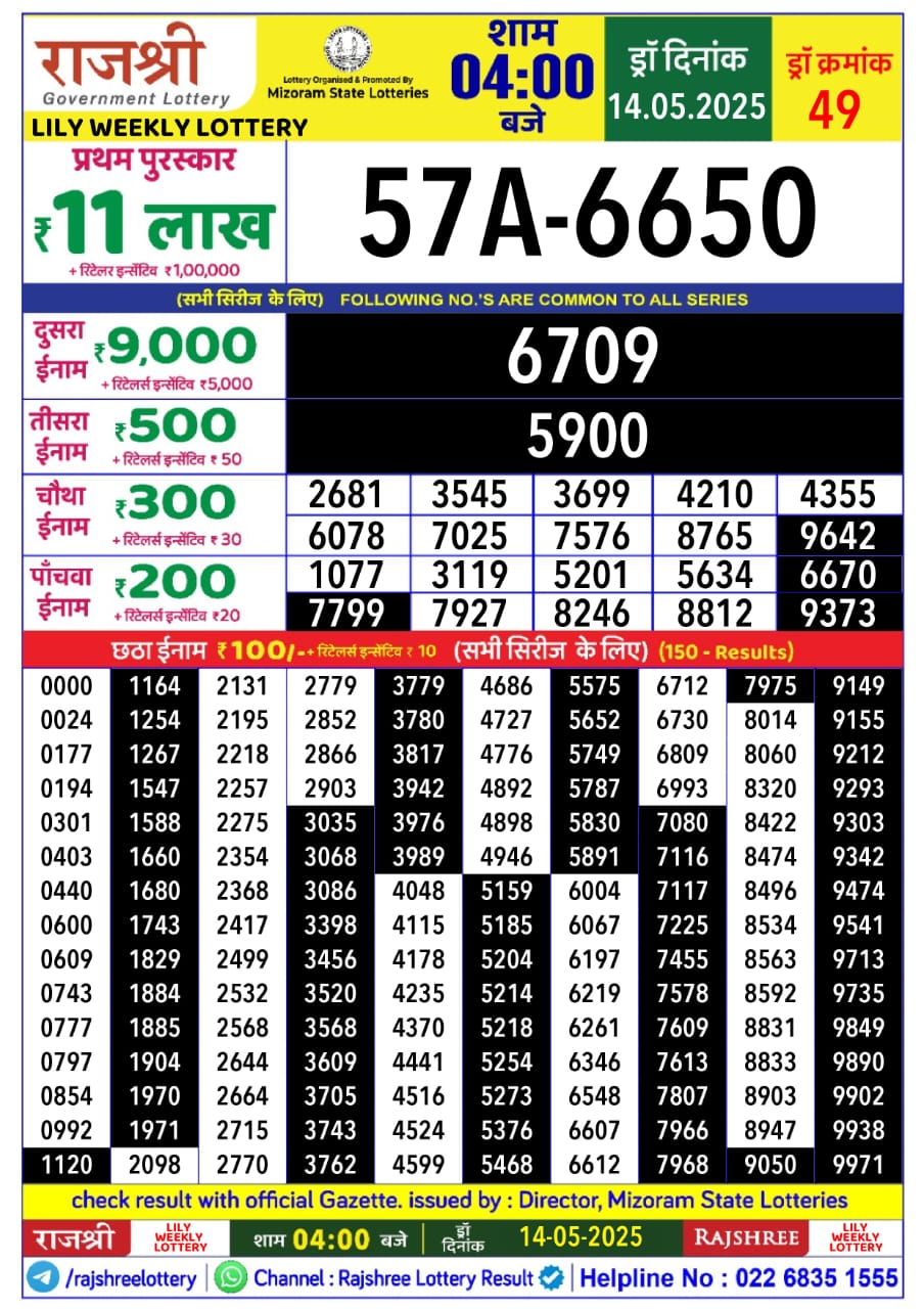 राजश्री लाटरी का 4 बजे का रिज़ल्ट दिनांक 14.11.25