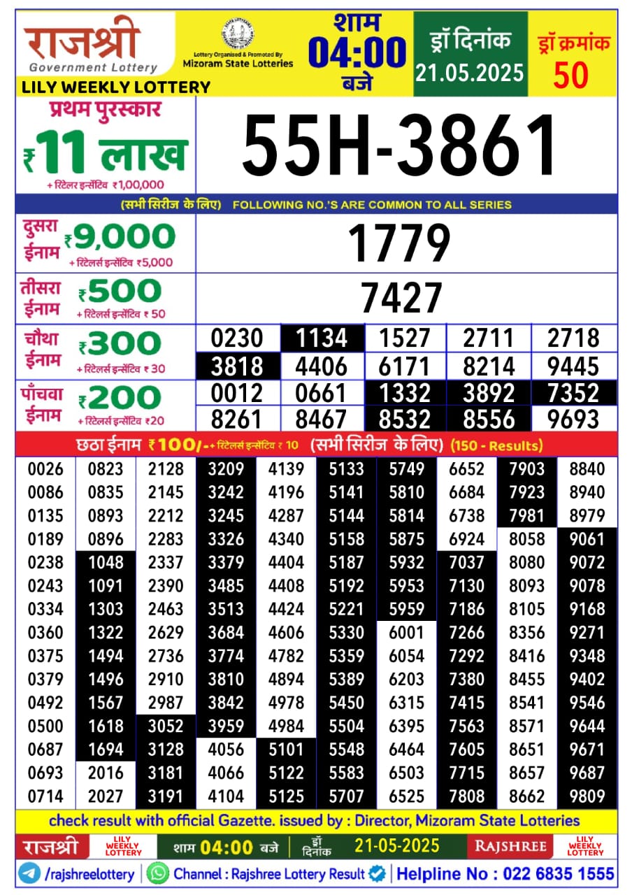 राजश्री लाटरी का 4 बजे का रिज़ल्ट दिनांक 21.11.25
