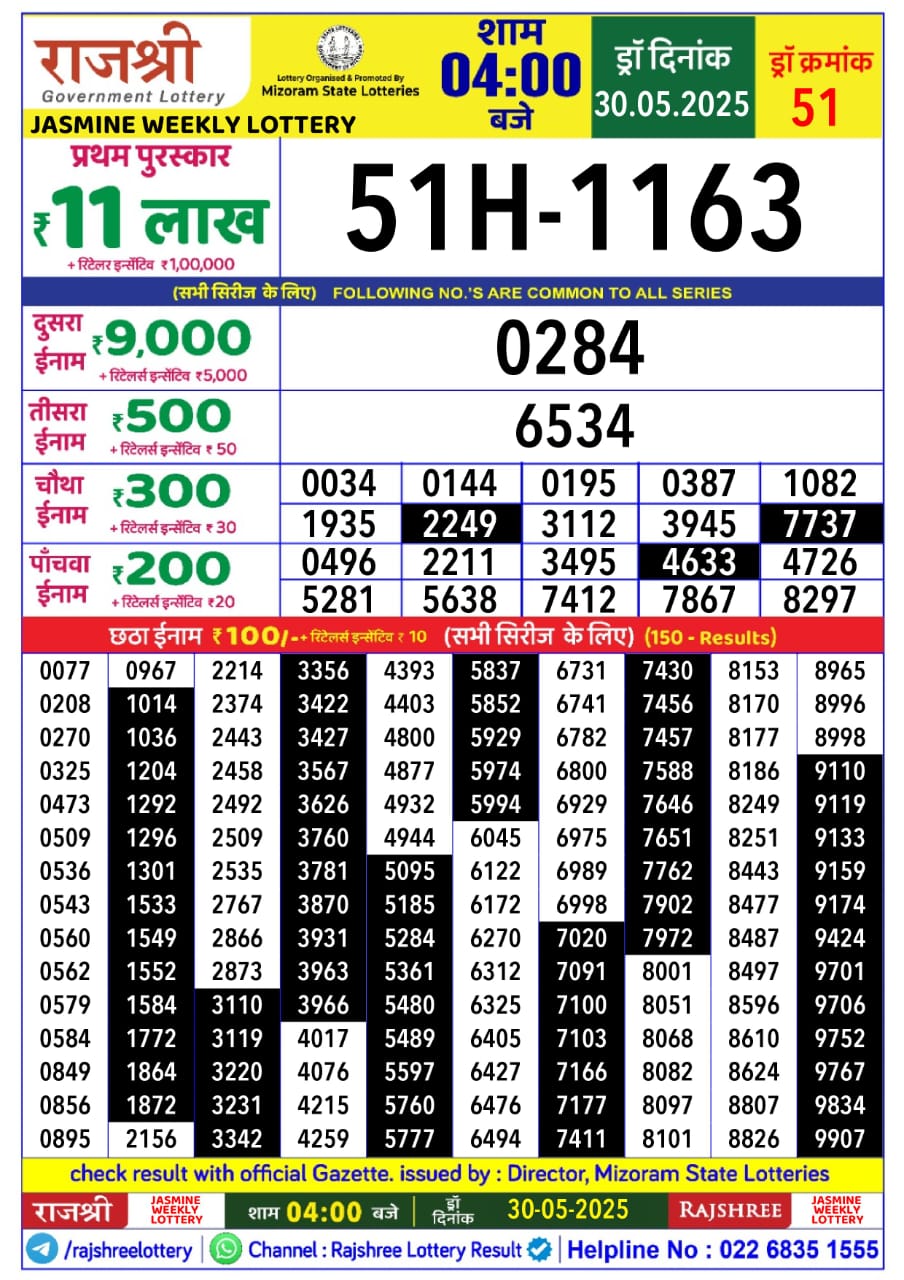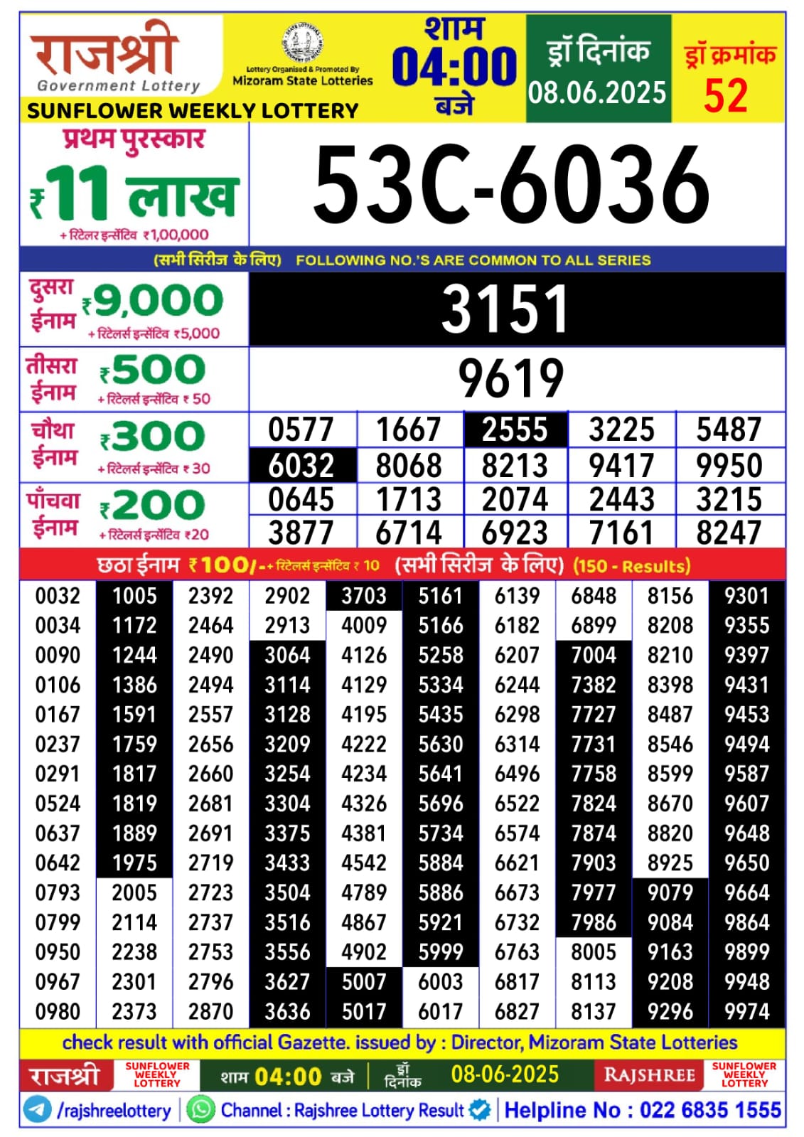 राजश्री लाटरी का 4 बजे का रिज़ल्ट दिनांक 06.11.25