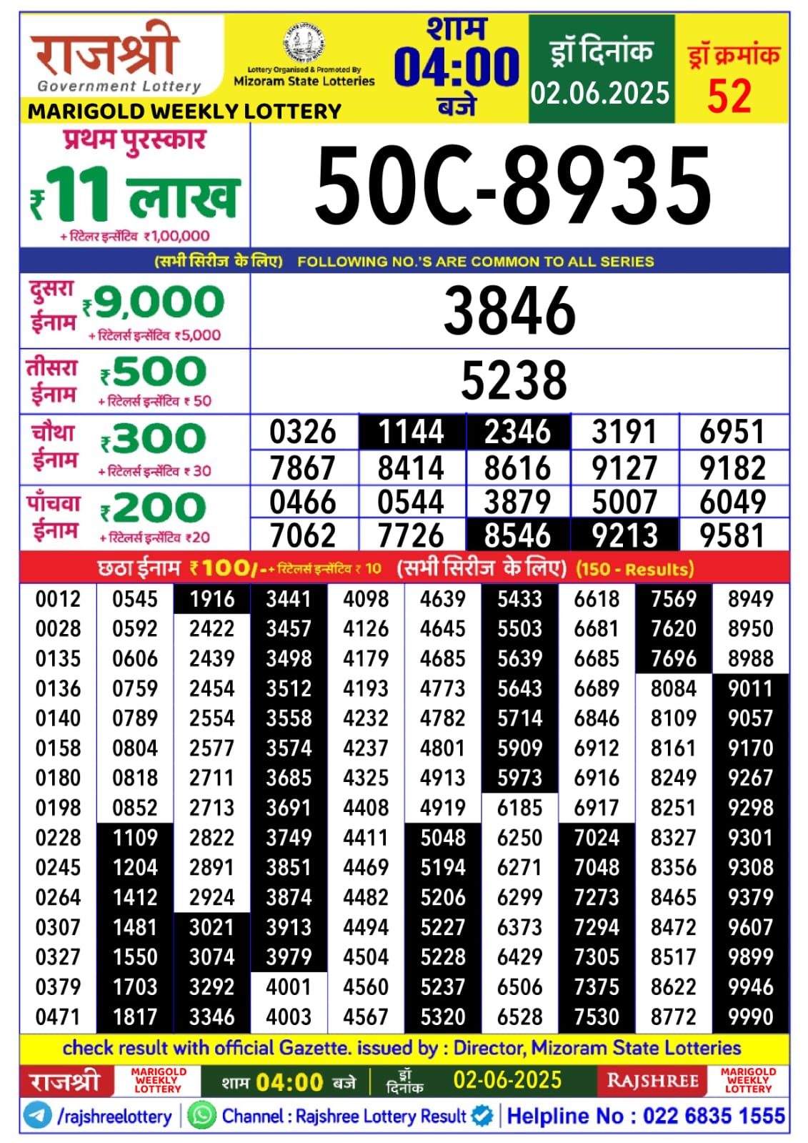 राजश्री लाटरी का 4 बजे का रिज़ल्ट दिनांक 02.12.25