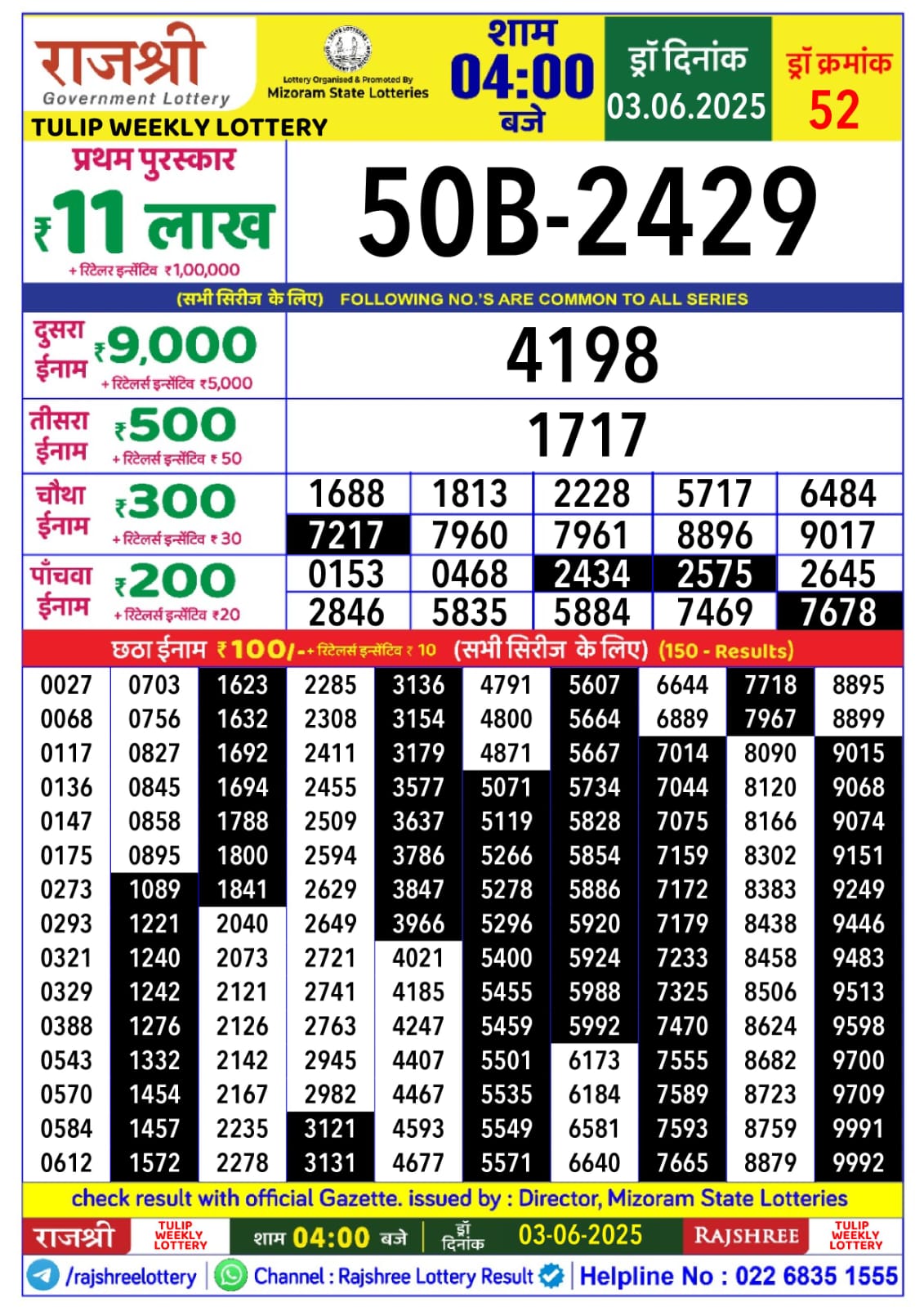 राजश्री लाटरी का 4 बजे का रिज़ल्ट दिनांक 03.12.25