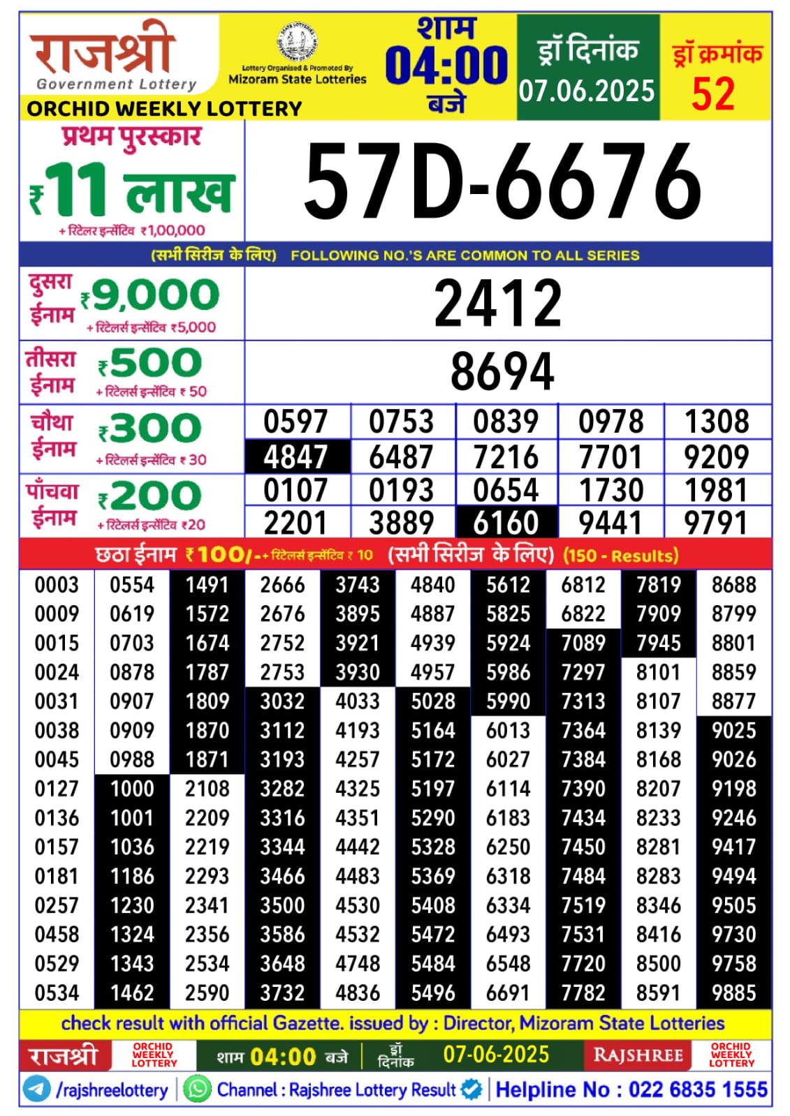 राजश्री लाटरी का 4 बजे का रिज़ल्ट दिनांक 07.12.25