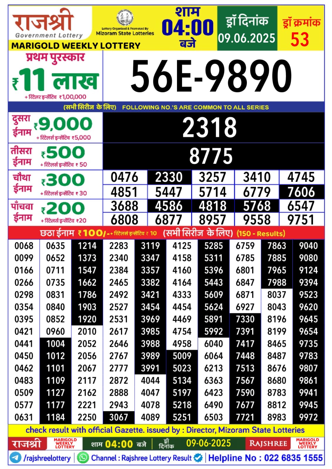 राजश्री लाटरी का 4 बजे का रिज़ल्ट दिनांक 09.11.25