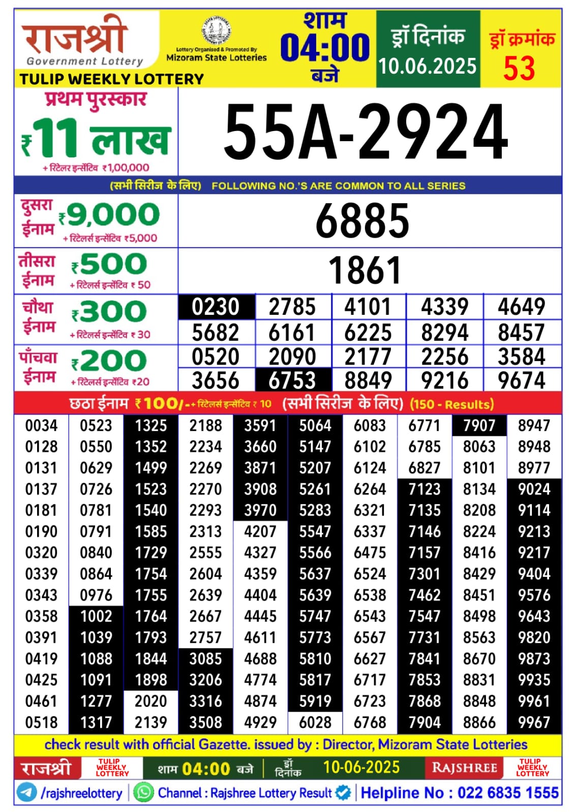 राजश्री लाटरी का 4 बजे का रिज़ल्ट दिनांक 10.11.25