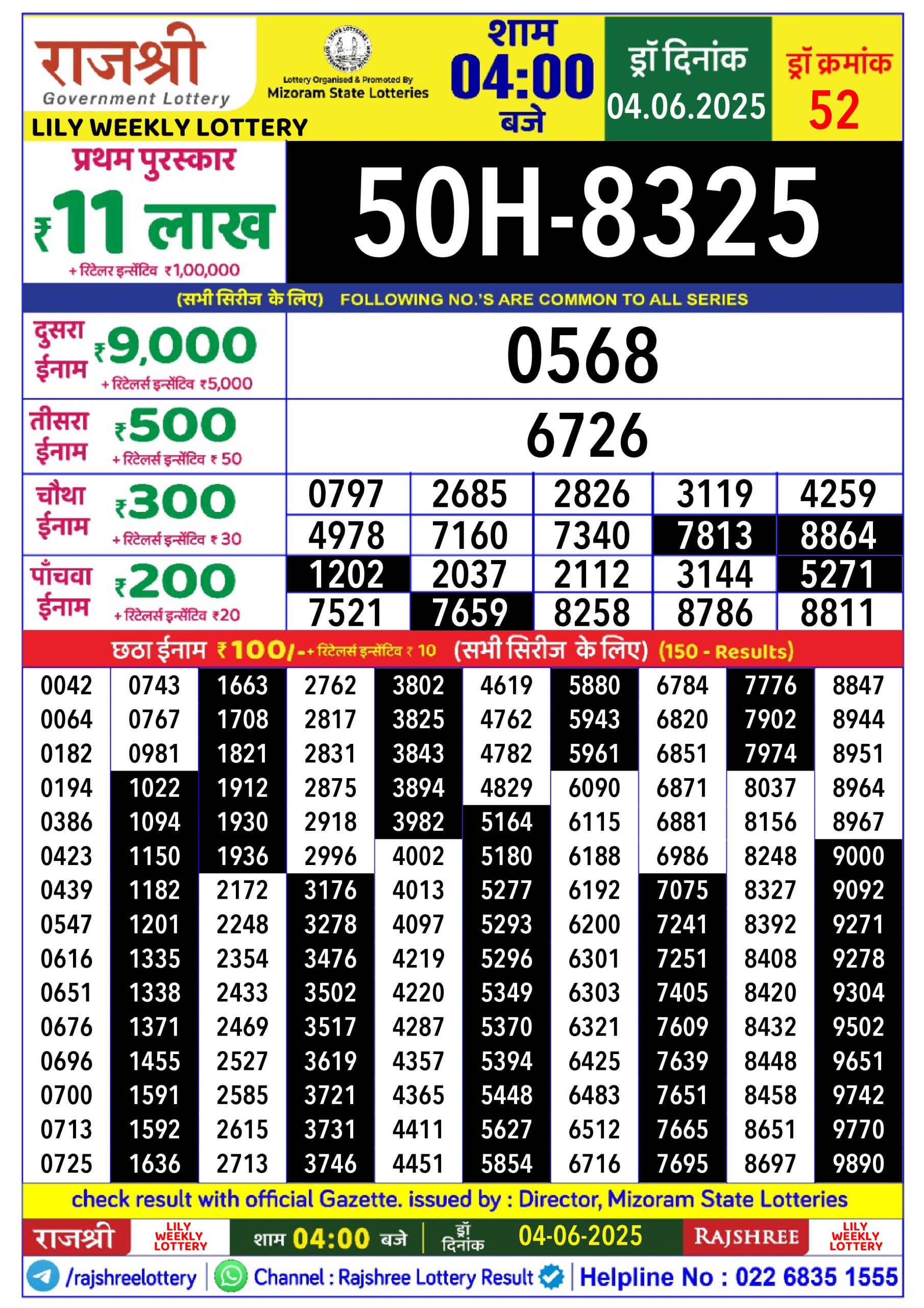 राजश्री लाटरी का 4 बजे का रिज़ल्ट दिनांक 04.12.25