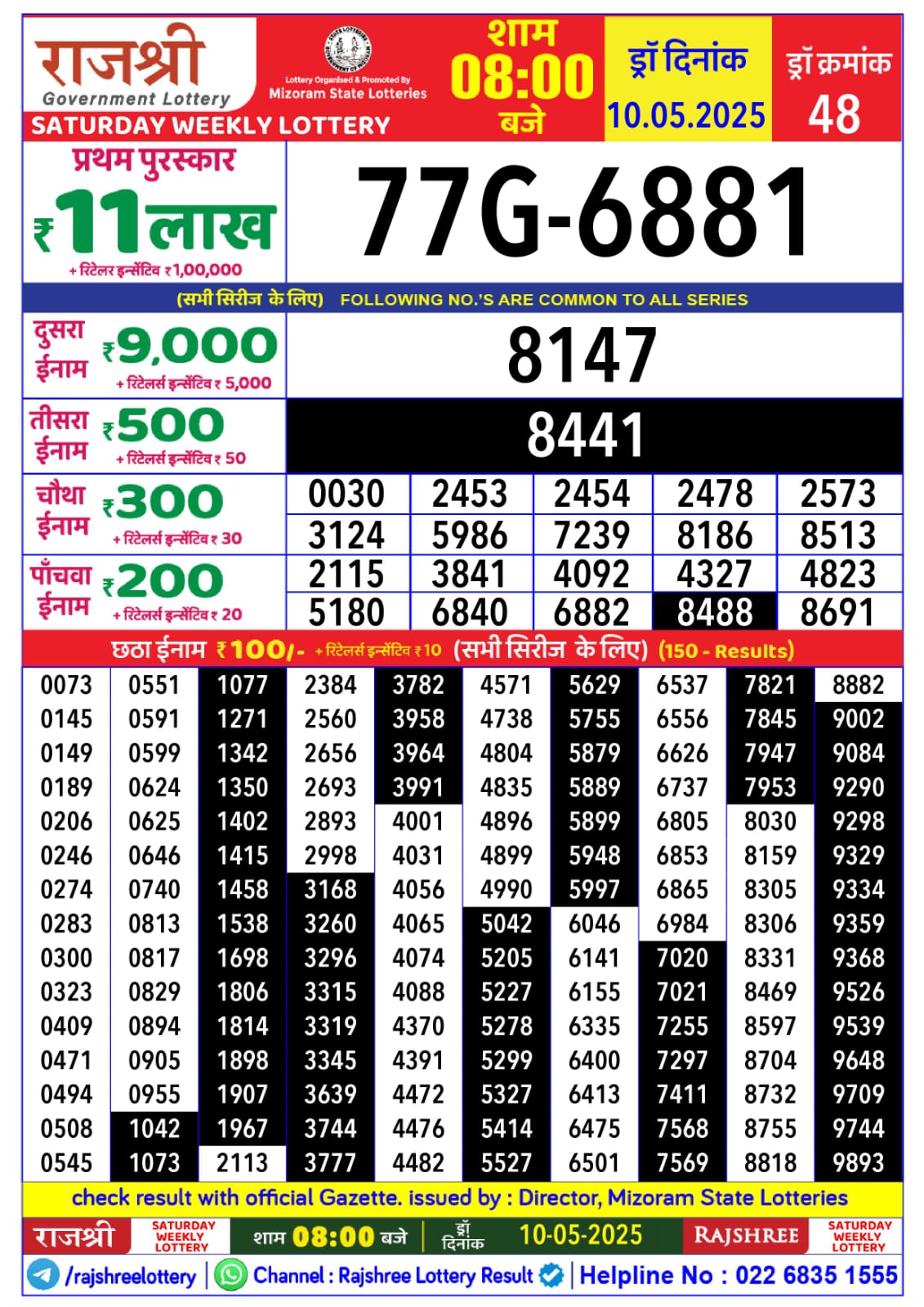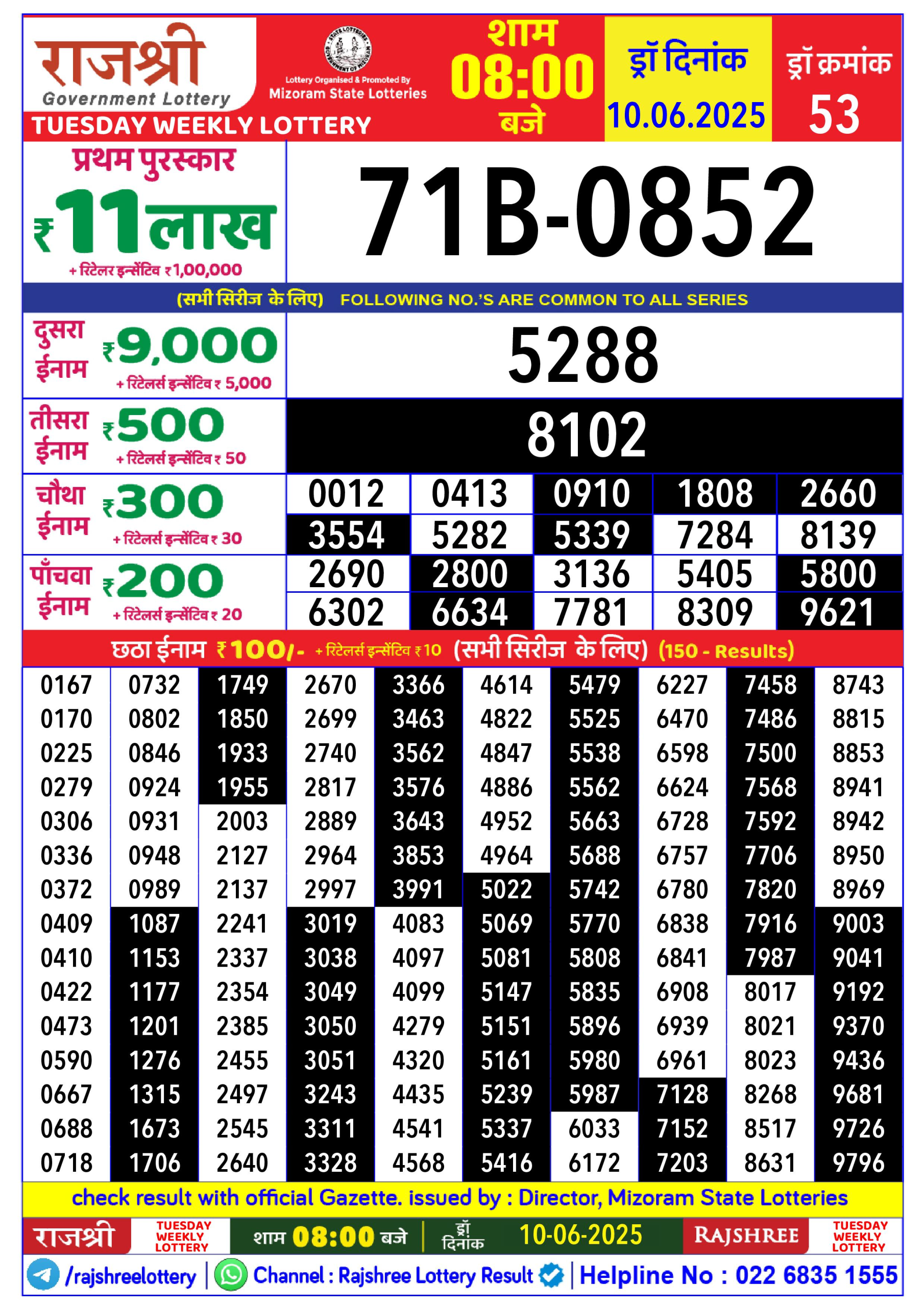 राजश्री लाटरी का रात 8 बजे का रिज़ल्ट दिनांक 10.11.25
