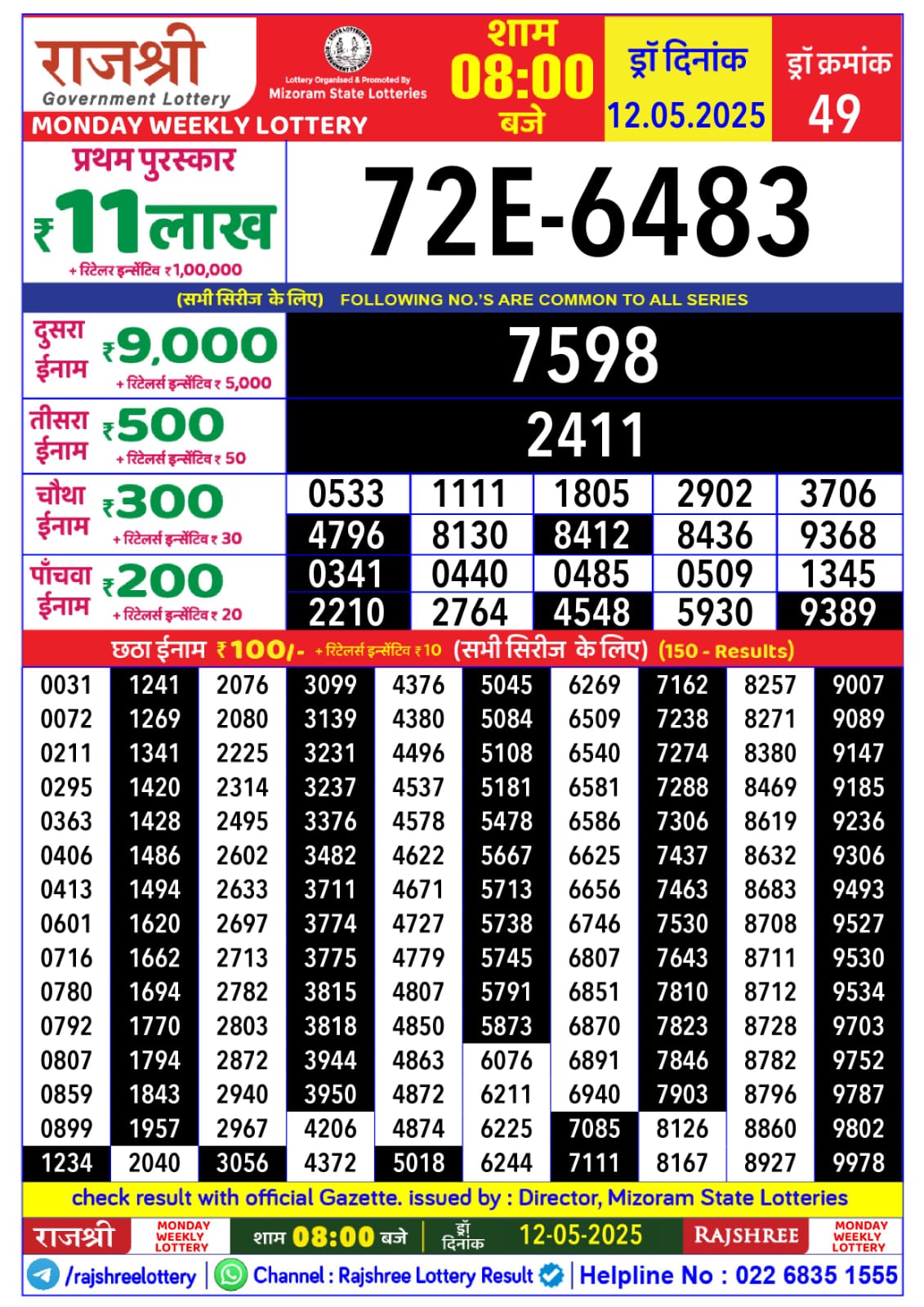 राजश्री लाटरी का रात 8 बजे का रिज़ल्ट दिनांक 12.12.25