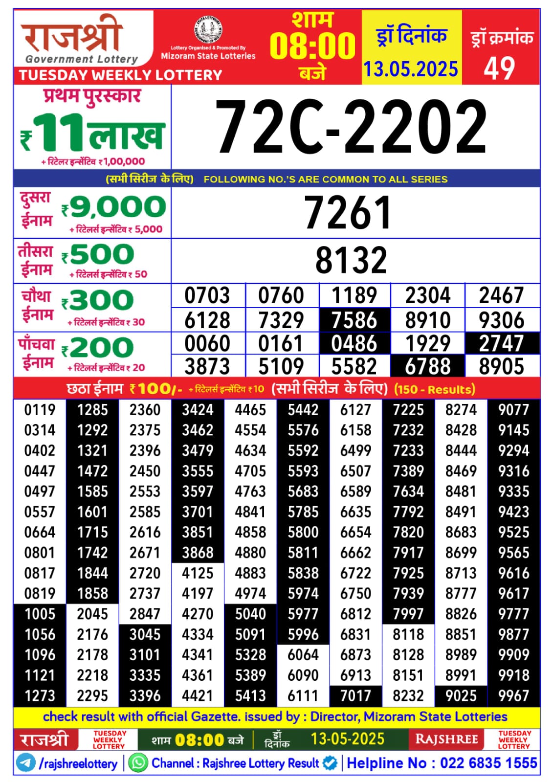 राजश्री लाटरी का रात 8 बजे का रिज़ल्ट दिनांक 13.11.25