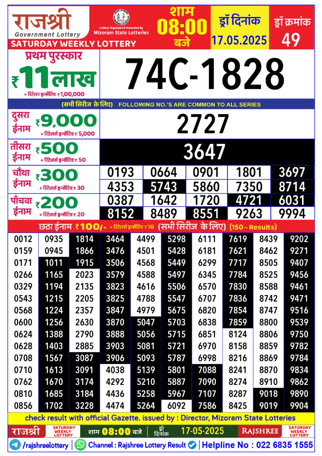 राजश्री लाटरी का रात 8 बजे का रिज़ल्ट दिनांक 17.11.25
