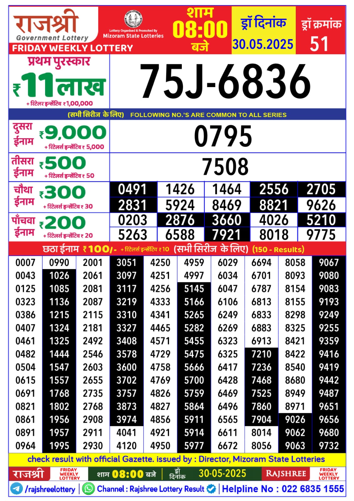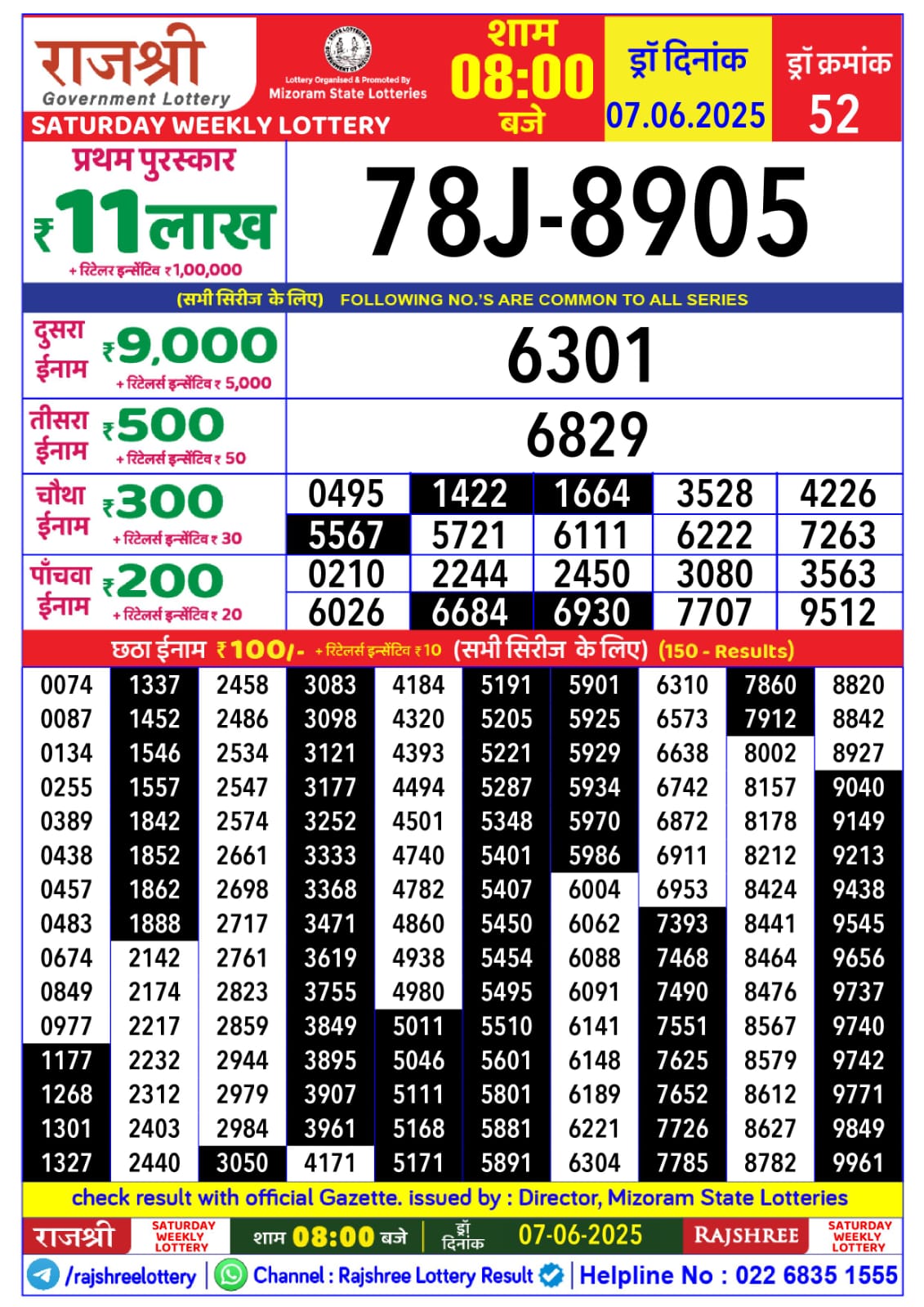 राजश्री लाटरी का रात 8 बजे का रिज़ल्ट दिनांक 07.11.25