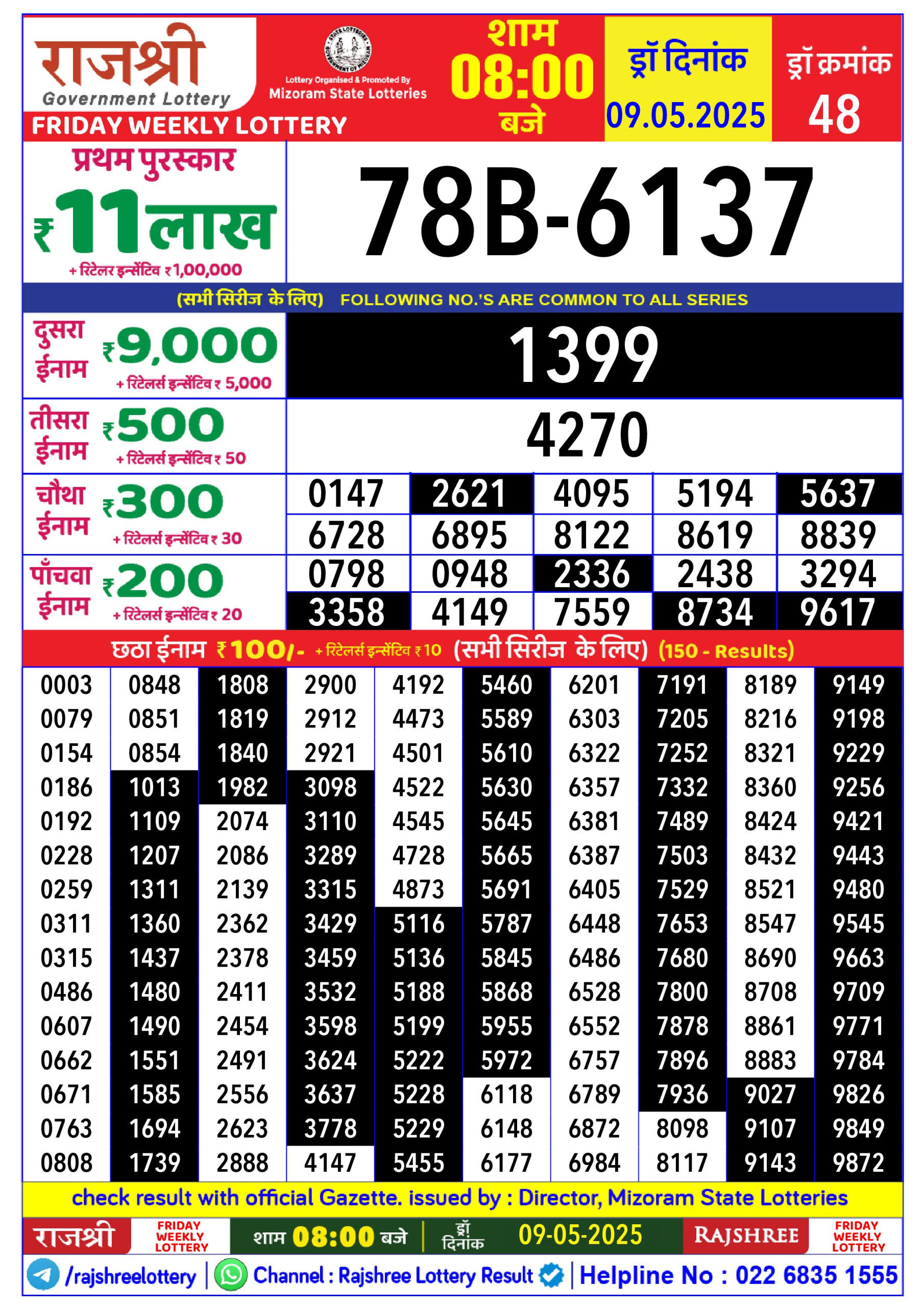राजश्री लाटरी का रात 8 बजे का रिज़ल्ट दिनांक 09.11.25