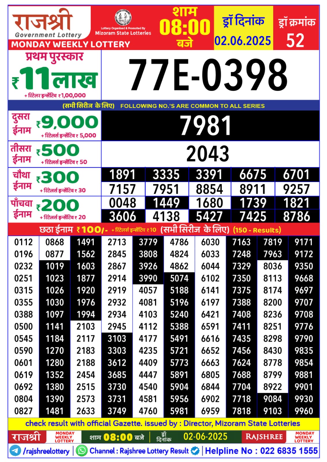 राजश्री लाटरी का रात 8 बजे का रिज़ल्ट दिनांक 02.12.25