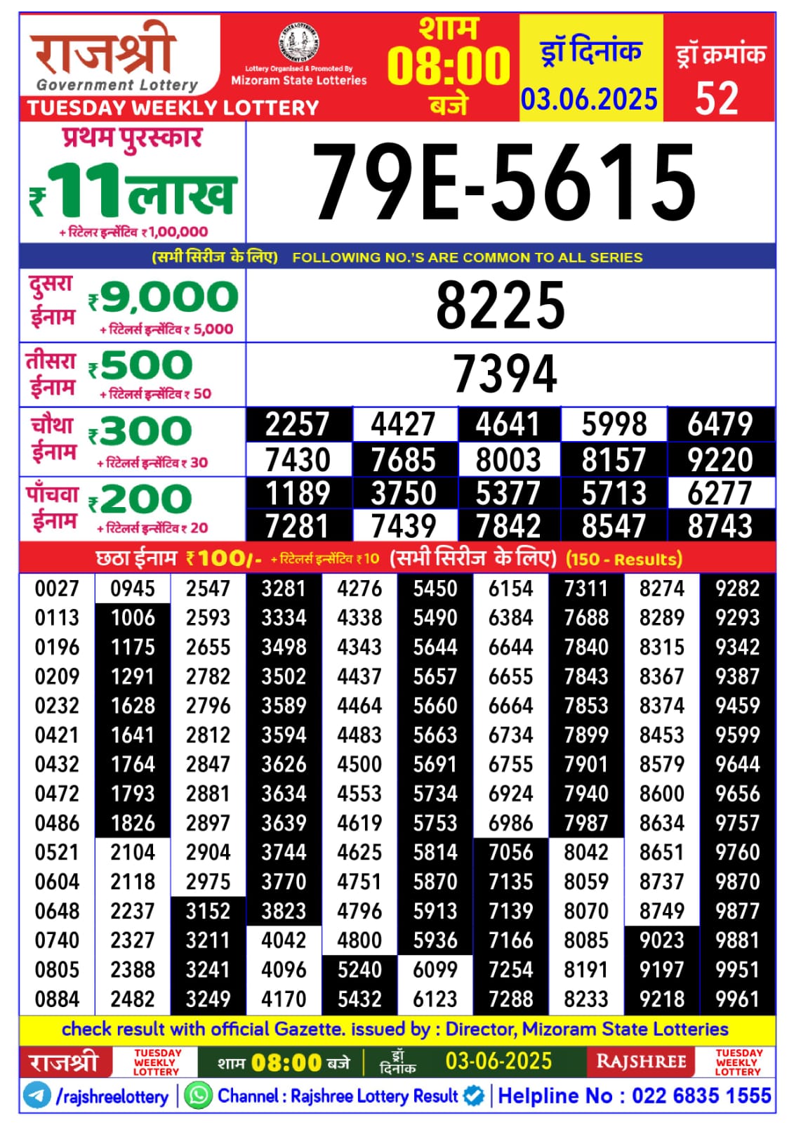 राजश्री लाटरी का रात 8 बजे का रिज़ल्ट दिनांक 03.11.25