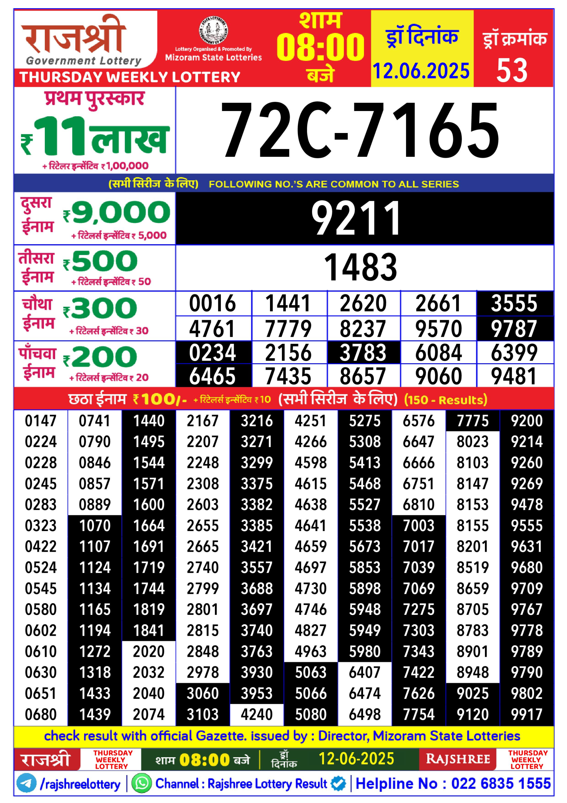 राजश्री लाटरी का रात 8 बजे का रिज़ल्ट दिनांक 12.11.25