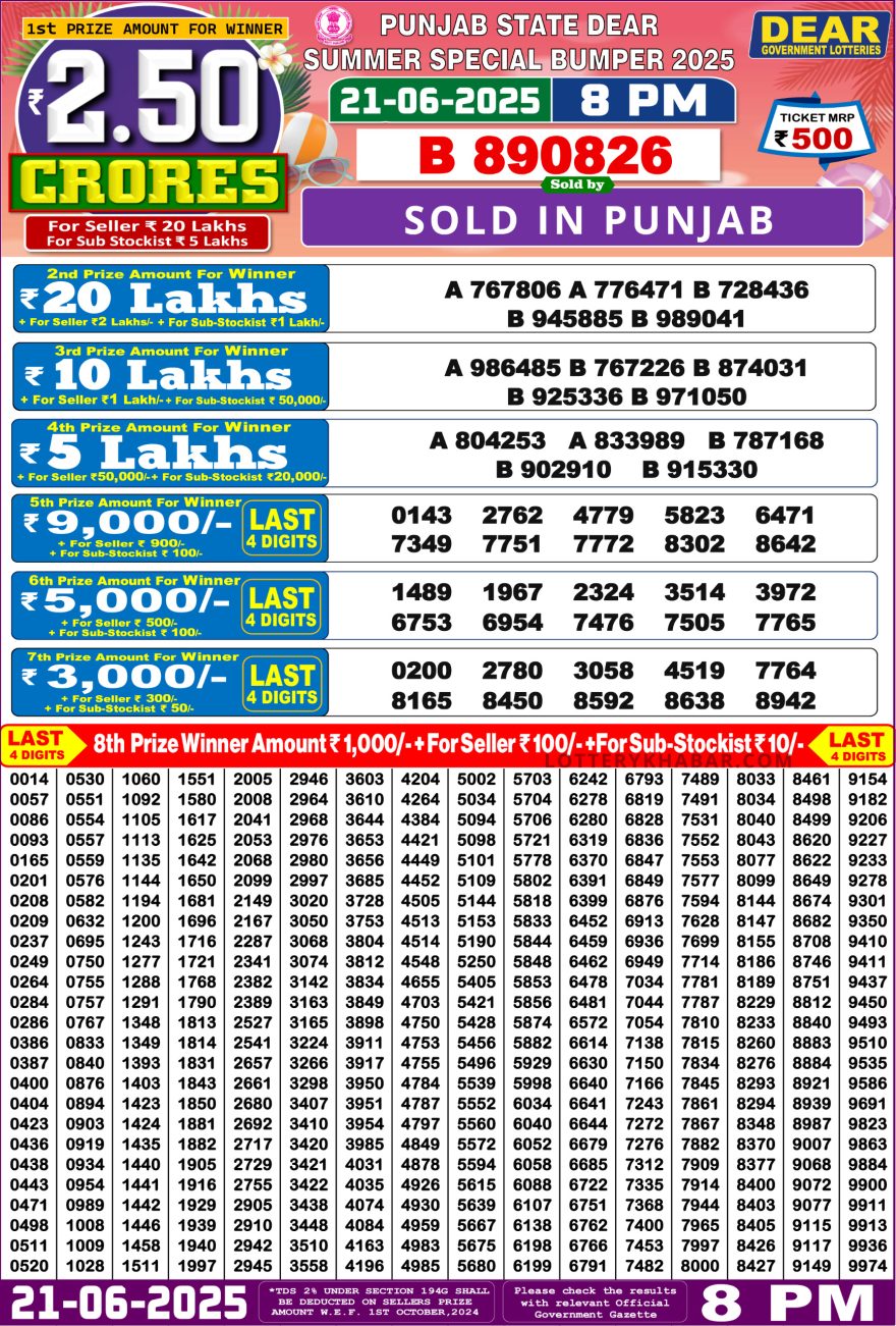 Punjab State Lottery Summer Special Bumper Result 21.6.25